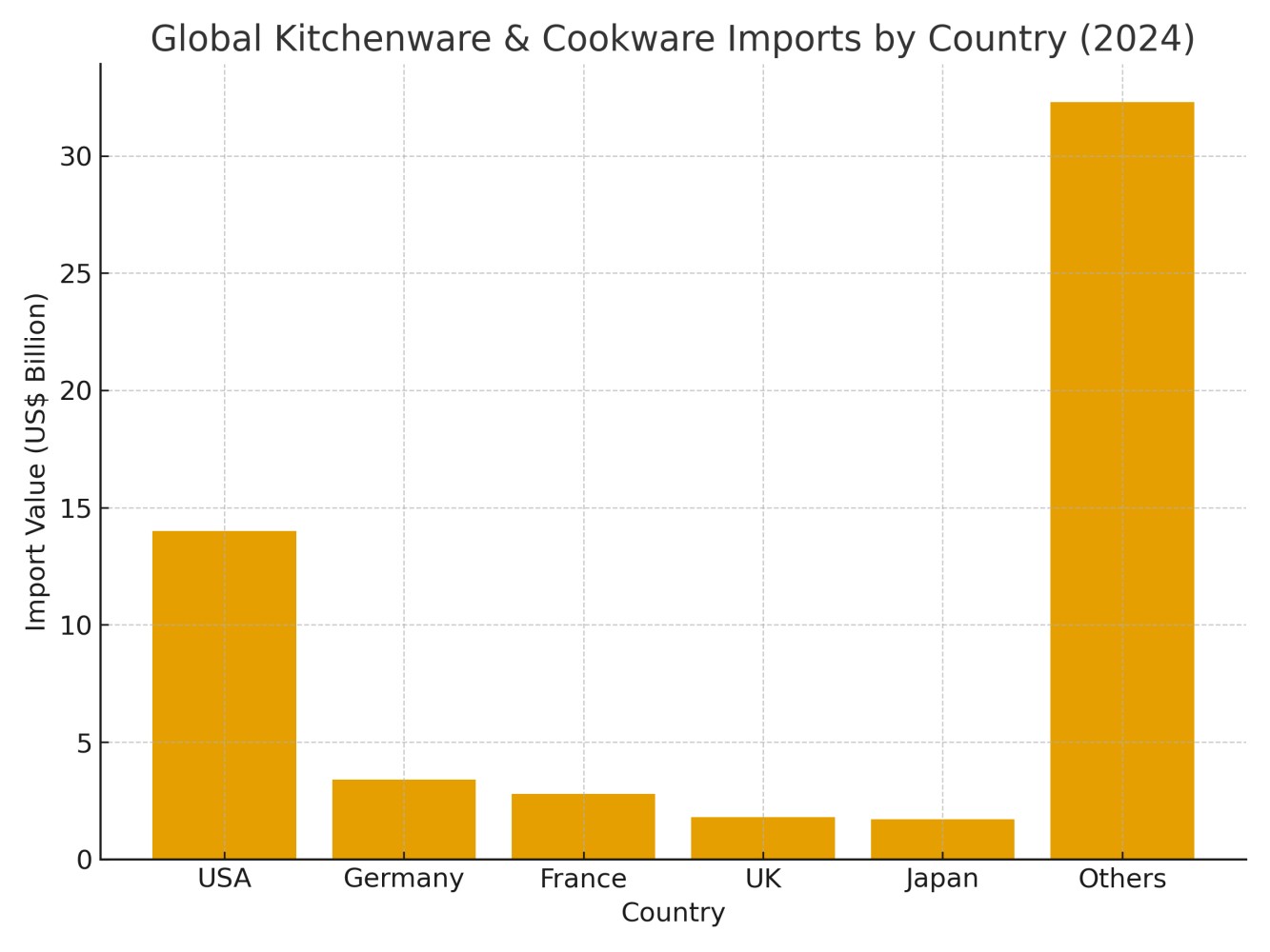 Global imports of kitchenware and cookware reached approximately US$ 56 billion in 2024, with a five-year CAGR of 4.3%, rebounding strongly from pandemic-related disruptions. The United States leads with a 25% share (US$ 14 billion), driven by a 12% increase in home improvement spending. Germany (US$ 3.4 billion) emphasizes sustainable stainless steel products, while France (US$ 2.8 billion), the UK (US$ 1.8 billion) and Japan (US$ 1.7 billion) prioritize premium and precision utensils. These markets, representing over 50% of global trade, highlight opportunities for high-quality, innovative and sustainable products.