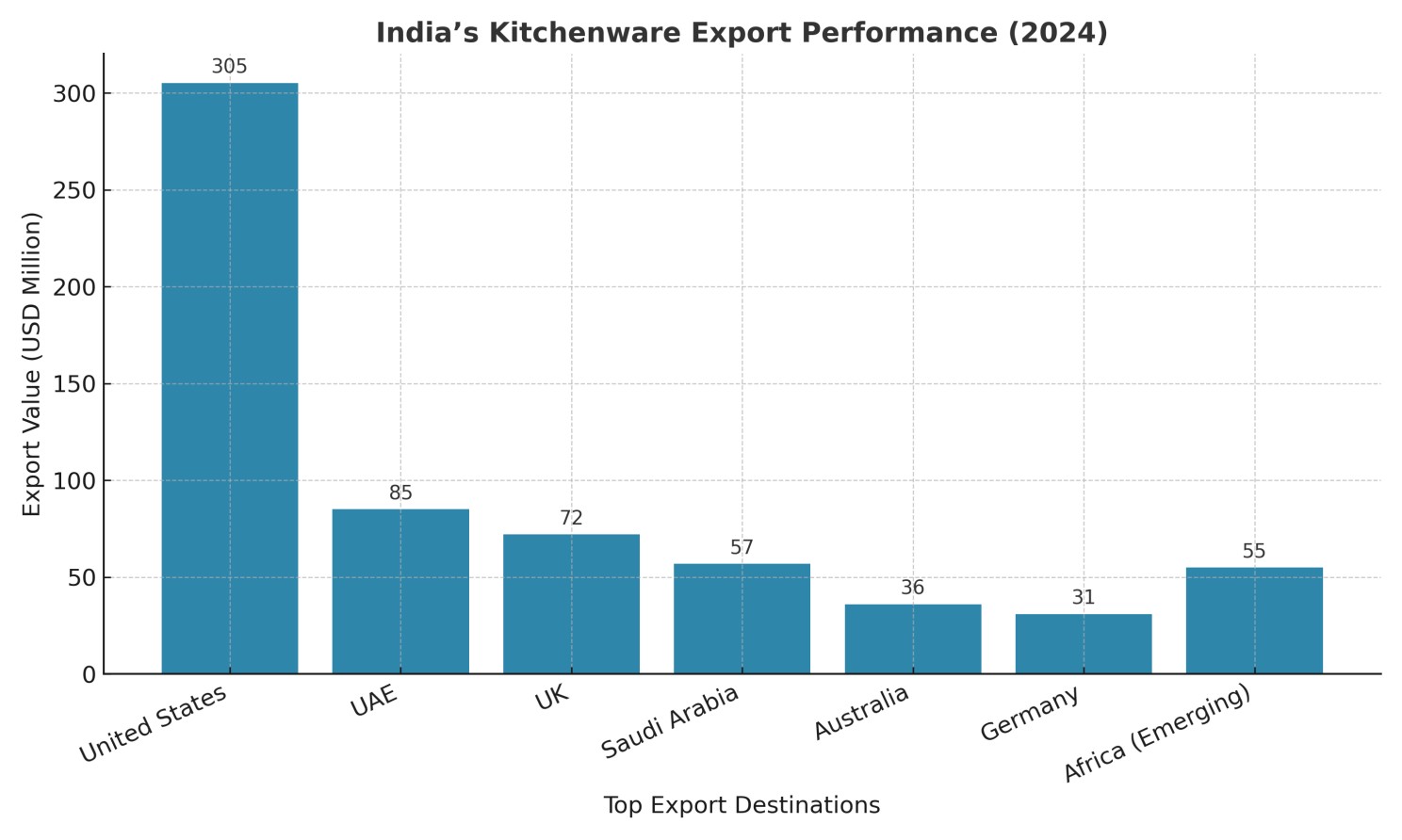 India's export performance is equally promising, with kitchenware exports reaching US$ 1.1 billion in 2024, reflecting a 2.5% five-year CAGR and securing a 1.7% global market share. The United States (28.4%, US$ 305 million), UAE (8%, US$ 85 million) and UK (6.7%, US$ 72 million) are key markets, driven by cost-effective stainless steel products and strong diaspora connections. Other notable markets include Germany (2.9%, US$ 31 million), Australia (3.4%, US$ 36 million) and Saudi Arabia (5.3%, US$ 57 million). Emerging markets in Africa, with a 5% share, offer untapped potential amid rapid urbanization.